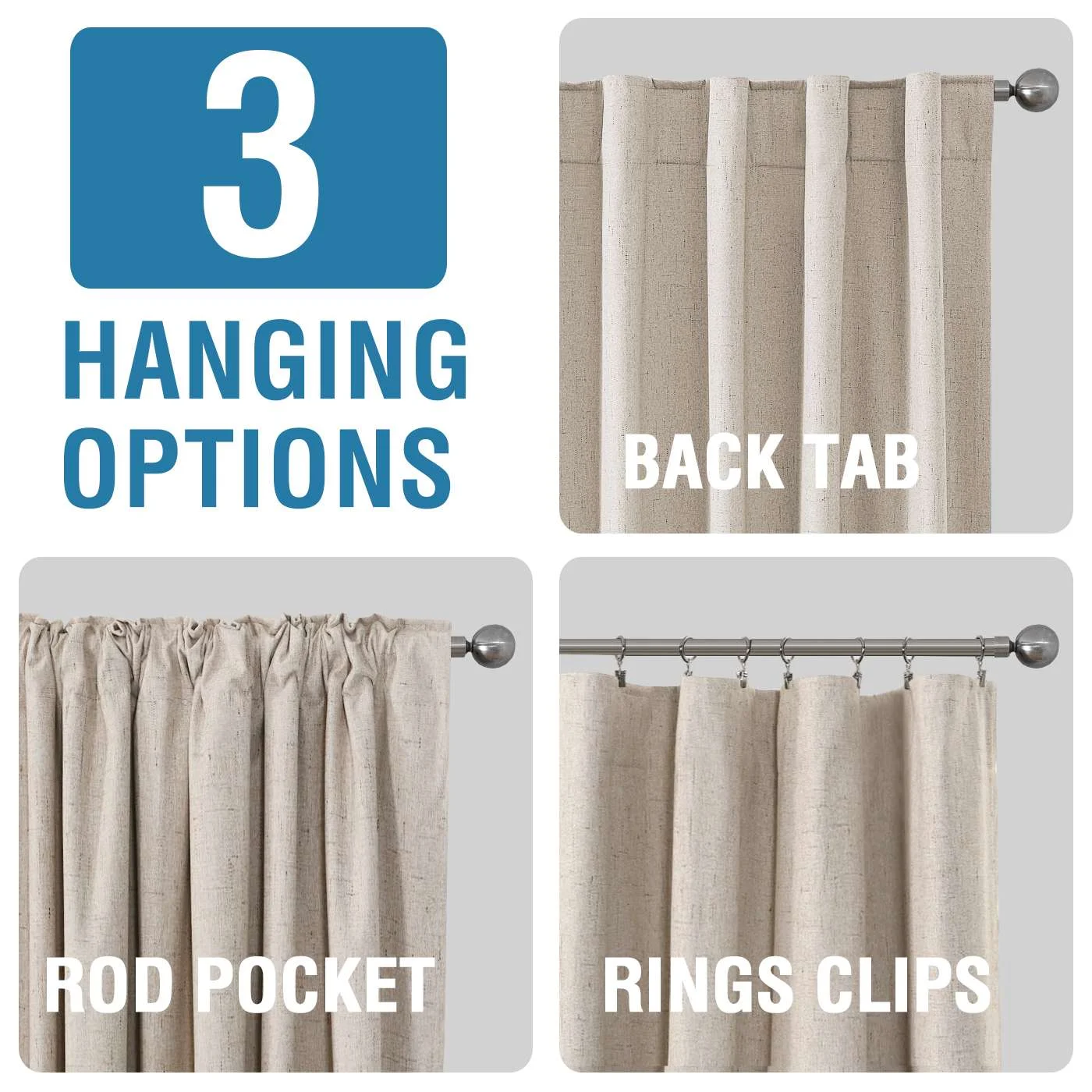 - Multiple Hanging Options: Includes two 52″W x 63″L panels (104″W combined) with 3 hanging styles (back tab, rod pocket, pleated) for versatile installation.