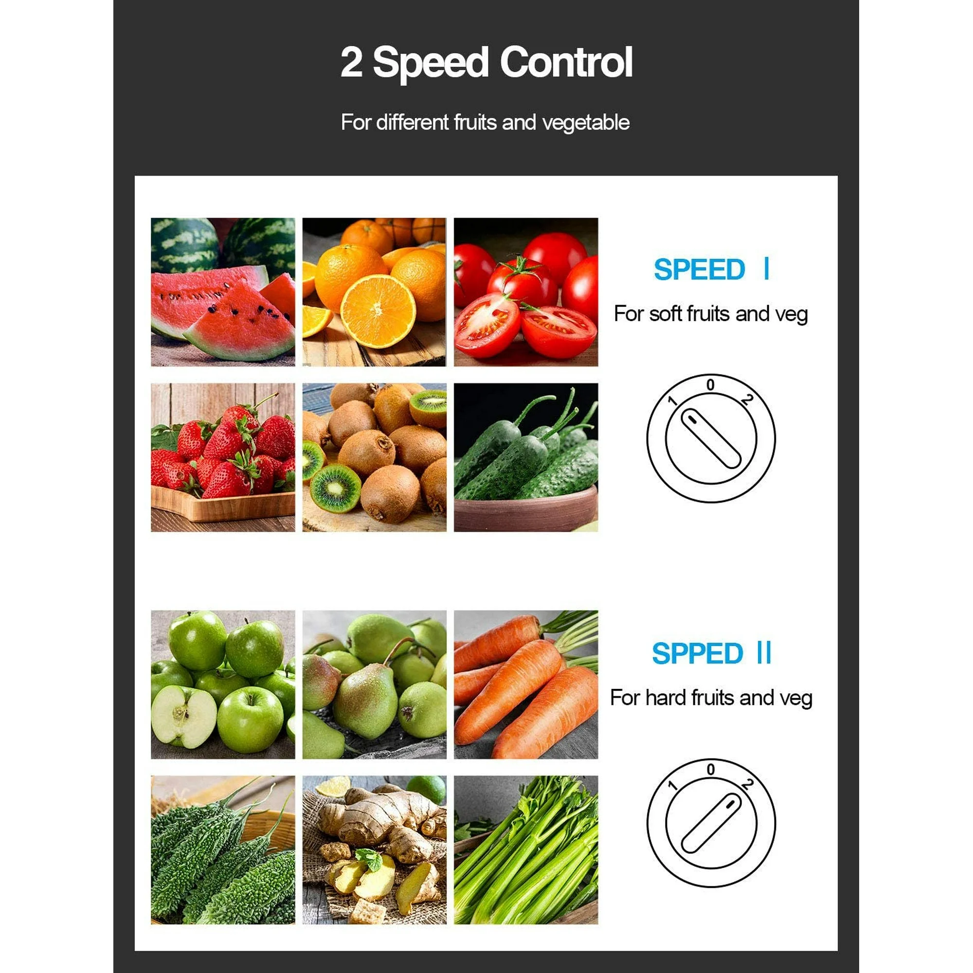 - Dual Speeds: Offers two-speed control (12000-18000 RPM) for versatile juicing, with “1” for soft fruits and “2” for hard fruits and vegetables.
